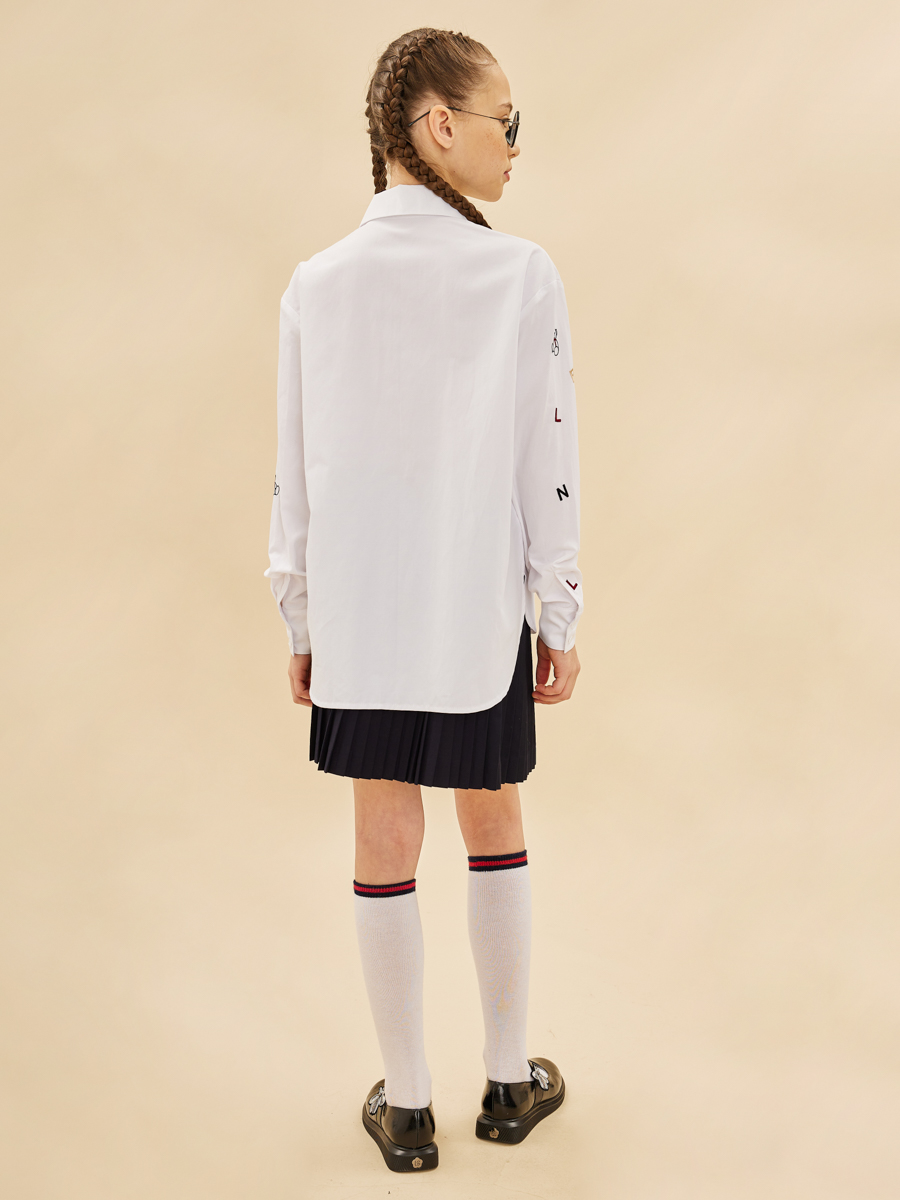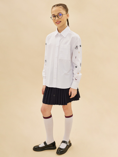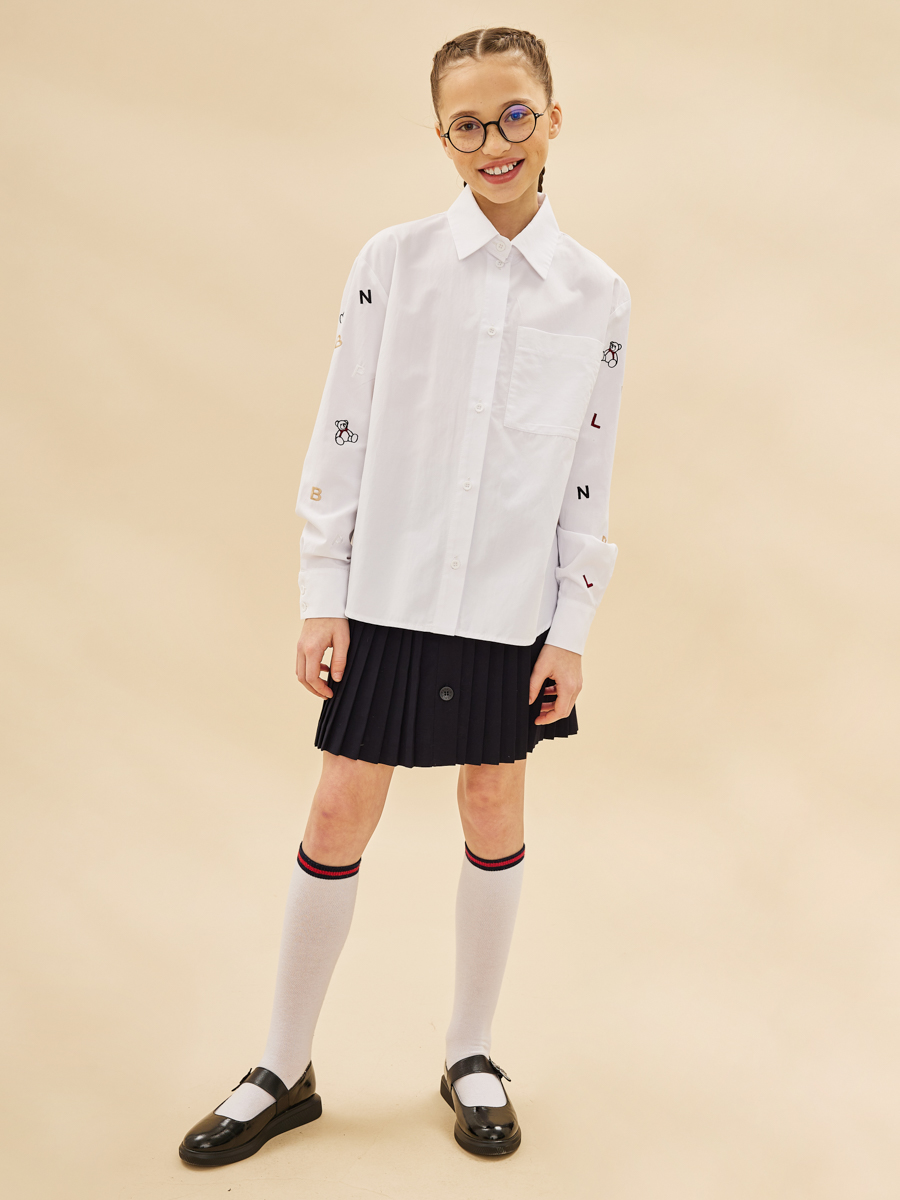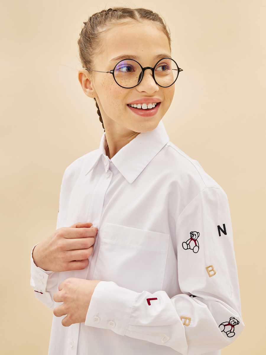 Детская рубашка свободного кроя из белой хлопковой смесовой ткани. Изделие имеет классический отложной воротник и застёжку на пуговицы по центру. На груди расположен накладной карман.Показать больше... Особенностью модели является декоративная вышивка на рукавах: разноцветные буквы из бренда NOBLE PEOPLE, расположенные в разбросанном порядке, а также изображение медвежонка на каждом рукаве. Манжеты выполнены с застёжкой на пуговицы. Низ рубашки скруглён, спинка удлиненная.Свернуть текст
